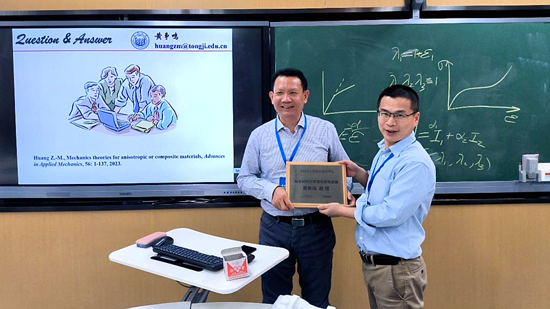 黄争鸣教授的精彩演讲激发了在场师生们浓厚的兴趣,报告结束后,现场展开了热烈的学术讨论。与会者们就相关学术问题展开深入交流,分享彼此的见解和经验。黄争鸣教授认真倾听并耐心回答了大家提出的问题,还分享了自己在复合材料力学理论研究方面的科研心得。在讨论的最后阶段,李元庆教授代表工程学部向黄争鸣教授表达了诚挚的感谢,并向其赠送了纪念奖牌。